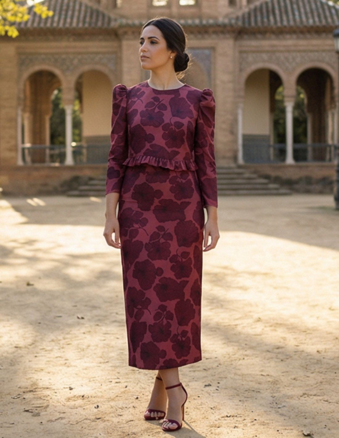 Le haut présente des manches longues avec un léger volume aux épaules et un volant au bas qui donne du mouvement et définit la silhouette. Les boutons dans le dos ajoutent un détail spécial qui complète le modèle avec une touche féminine et soignée. La jupe midi, de coupe droite, affine la silhouette et équilibre la tenue, la rendant à la fois confortable et élégante.