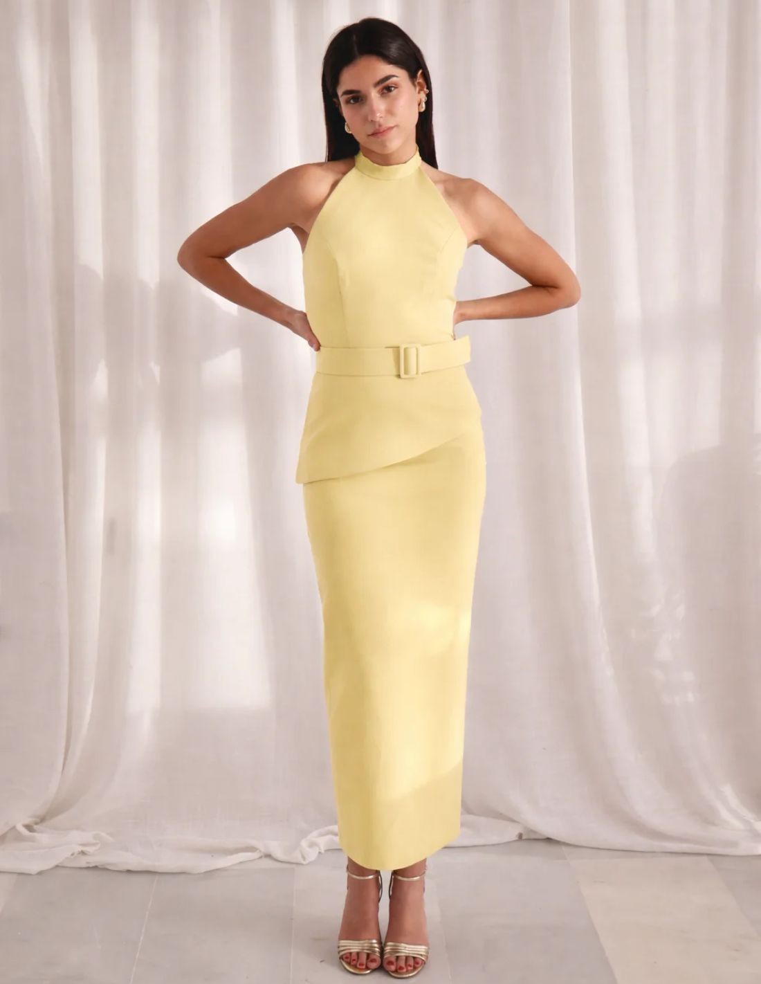 Ensemble couleur beurre avec dos nu asymétrique, ceinture assortie et jupe midi avec fente dans le dos. Élégant et sophistiqué.