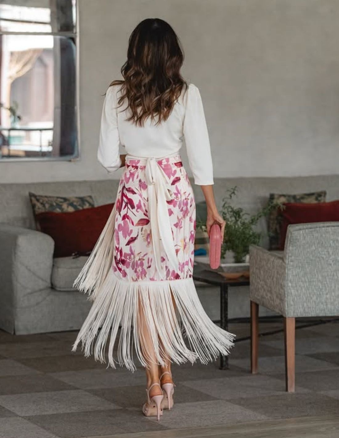 Cet ensemble blouse et jupe imprimées, drapées sur le devant et à franges, est le choix idéal pour les personnes à la recherche d'un look original, flatteur et plein de caractère. Le drapé sur le devant affine la silhouette et donne un effet enveloppant très élégant, tandis que les franges apportent du mouvement et une touche sophistiquée qui ne passe pas inaperçue.