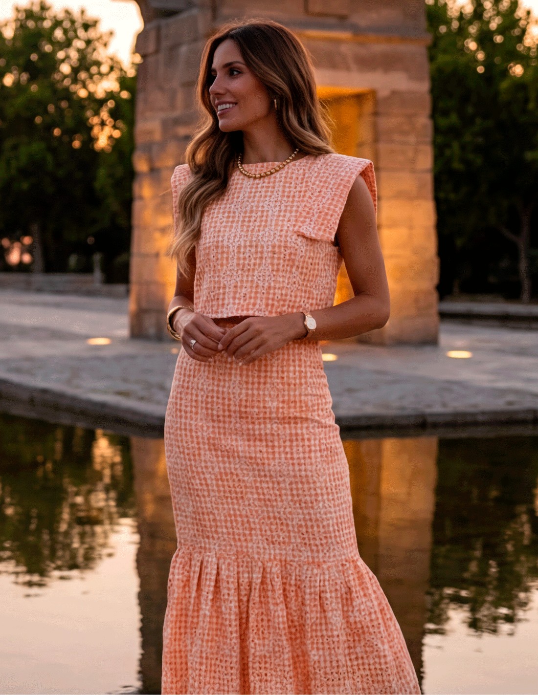 Le haut structuré ajoute de la définition et de l'élégance, rehaussant le haut d'une finition polie et moderne. La jupe midi adoucit l'ensemble avec un drapé fluide, offrant mouvement et confort à chaque pas.