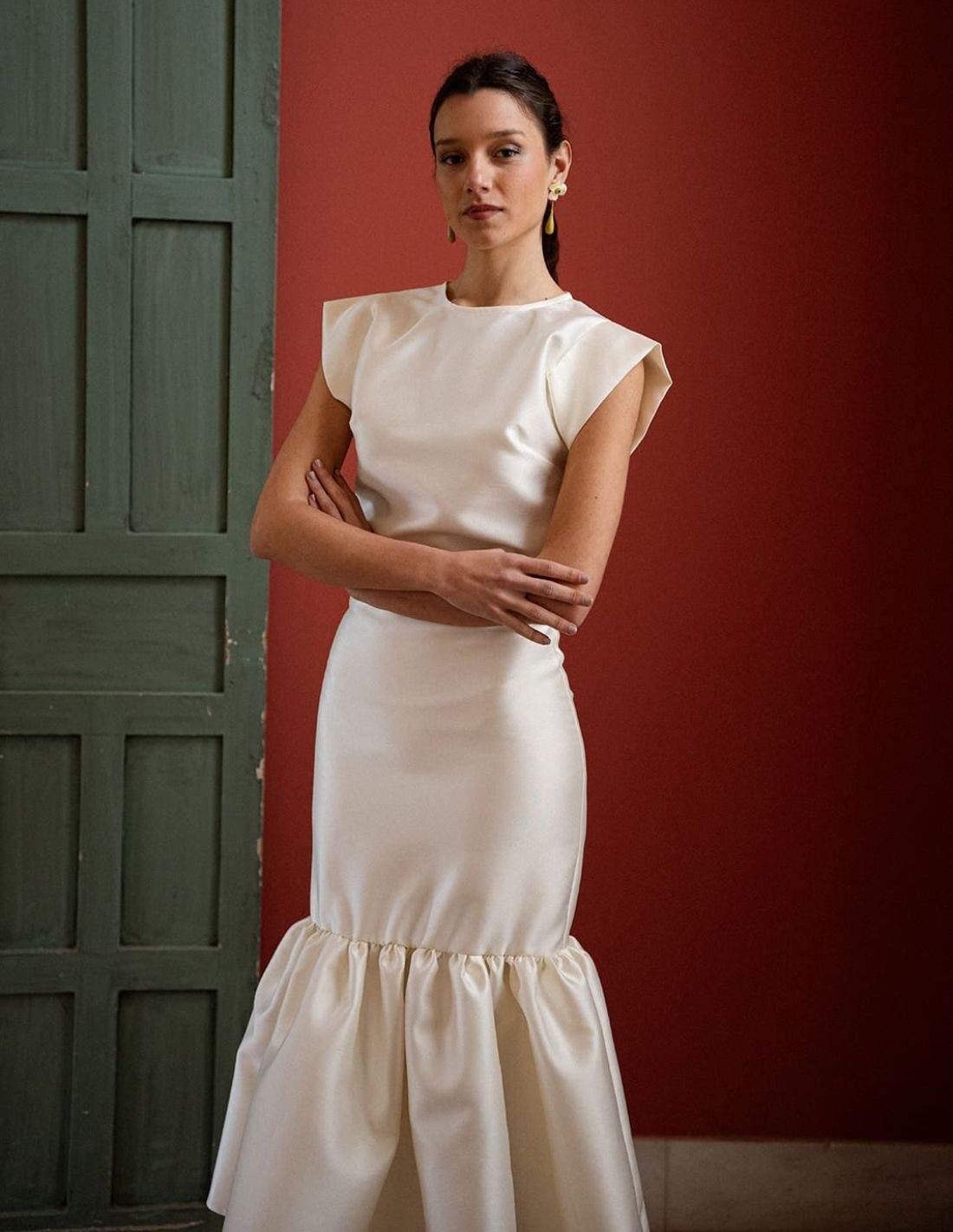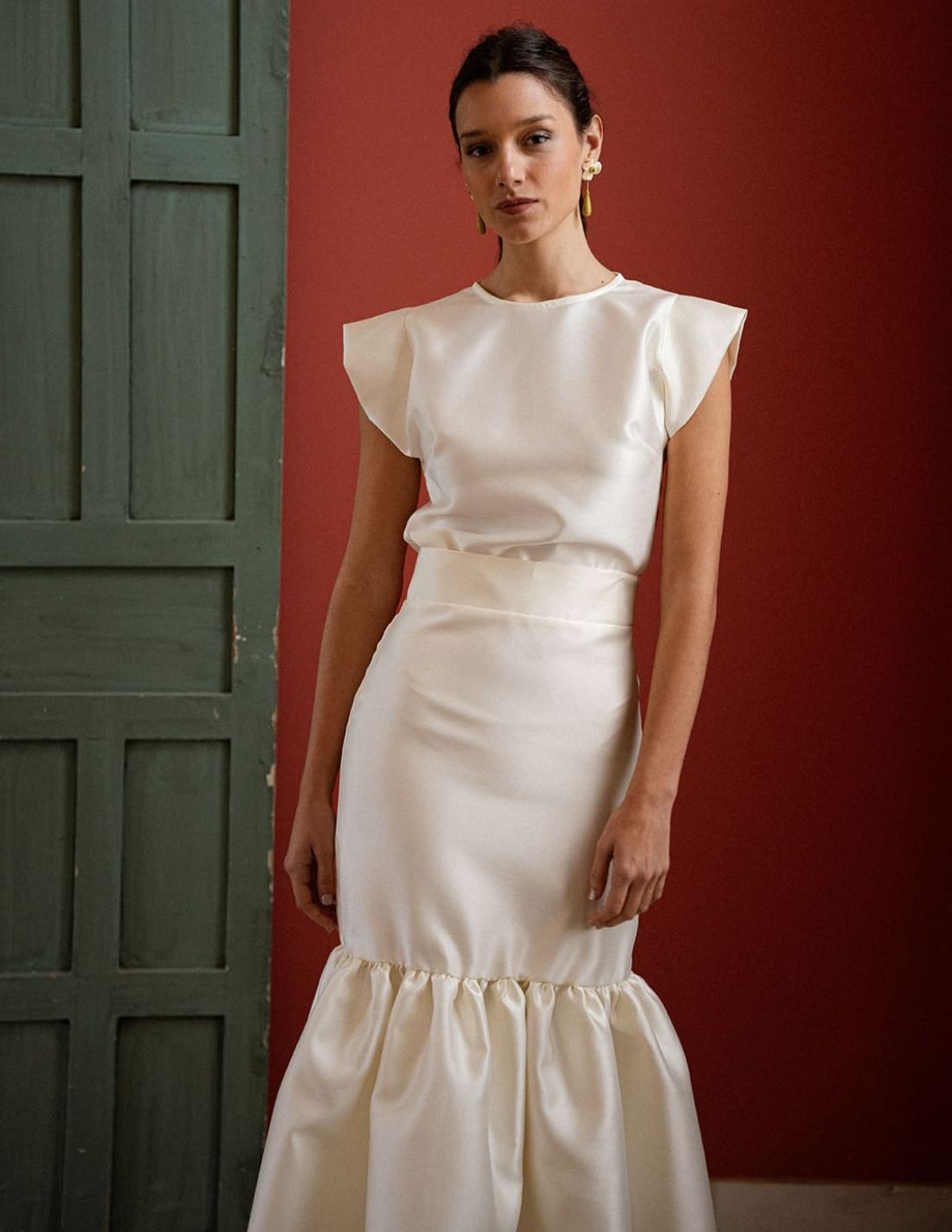 Haut de page de mikado à couleur écru, conçu pour ceux qui recherchent l'élégance avec a touche contemporaine. Fabriqué chez a tissu tissu structuré y légèrement satin, ce top se distingue par son drapé impeccable y son finition finition sophistiquée.