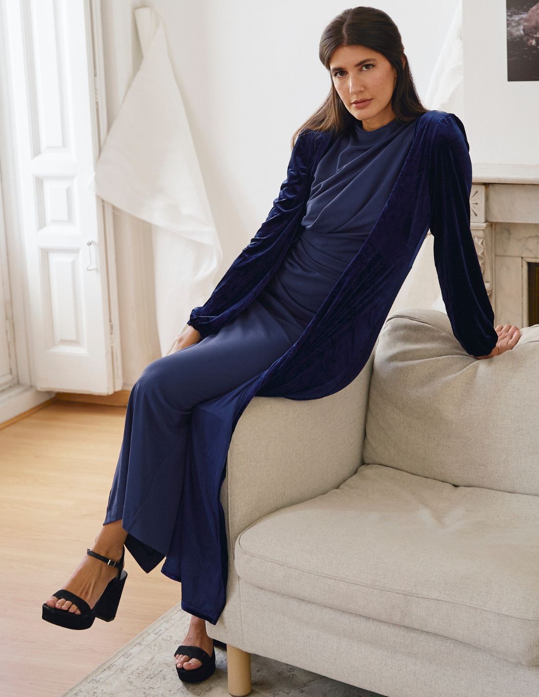 Manteau midi en velours bleu avec encolure croisée pour les invités et les occasions spéciales.